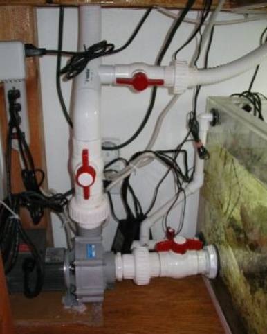The rest was easy (if a bit damp). Install the pump (with 1/8" to spare) and replace the plumbing to the skimmer and tank. The dual union valves are available from the online aquatic stores. The 1/4" speed-fit fitting on the left of the Cross is for going to a Calcium reactor (not shown). The stub coming towards the camera is for attaching another pump. Some day I want to go with dual pumps so that if one dies, the other can still run the system. The top 1" ball valve goes to the skimmer. The digital timer is for the Kalk reactor, and the two black devices hanging from the stand is for the dual 200 watt ViaAqua Titanium heaters.