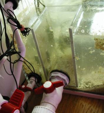 The tricky part of this setup is that I did not want to drain the water level in my sump/refuge all the way to the bottom. Taking the water to within 1" of the bottom means everything in the tank is high and dry, including the one lawnmower blenny that there is no way I could catch (He drafted a ride down the return from the frag tank months ago). With a 4" DSB, it also means draining the water from the lower levels, which could have really bad effects.