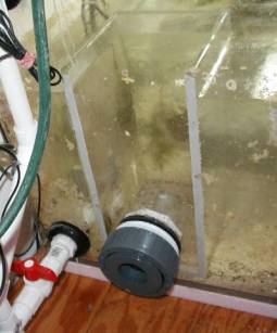 Onwards: Moving the sand out of the way stirred up a silt storm, hence the cloudy water, but here is a shot with the box in place. The left hand 1/2" bulkhead is my drain- To do a water change, I open it up and it routes directly to the floor drain. Above that is my emergency overflow- If the water level in the sump ever gets to within a 1/4" of the top, it goes though the bulkhead and direct to the drain.