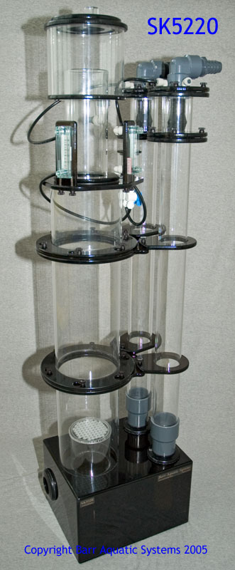 These skimmers are custom designed for a greatly increased contact time. The SK5220 has over 100 inches of air-water contact time for superior stripping of organics from the water. Many other skimmers attempt to get by with a contact length of less than 12". This design will pull out more organics per pass of water though than designs with short contact paths. The two primary models utilize a single Beckett injector which allows them to use a smaller pump, (and less electricity), yet due to the unique design the performance is excellent! Each of the primary models can be expanded with a second injector tube. The second tube make them in to "Dual Beckett" systems and are optimized for larger systems or for the quickest response to organic load changes (for example with commercial accounts that get in large fish shipments weekly). The Beckett injector design creates a tremendous amount of foam by using an advanced venturi effect that is more powerful than any other venturi. This mixture of air and water is driven down the large diameter mixing tubes, though the unique baffles structure in the box and back up the main tube via a central 5" mixing chamber, which feeds a 4" deep-injection port topped with a dispersion plate. This tube is coaxially located within the main tube and extends up in to the main tube to force the air/water mixture deep in to the central column for an extremely long contact time. This gives a smoother transition, reduces disruptive turbulence and also greatly reduces the bubbles that the skimmer outputs though the gate valve. Note that "swirling" is neither necessary nor desired (See here). The unique baffle system internal to the box virtually eliminates the disruptive "burping" of air that many competing skimmers have. Easy Maintenance- Twist lock flanges can be removed with a simple 15 degree turn, and are at all key points on the skimmer- Collection cup lid, neck and injection chamber (3 total). Key holes, thumb screws and captive O-rings are used on joints that are not normally taken apart for cleaning. No removing the pump line just to clean the cup! The pump does not even need to be shut down. Simply open the gate valve a full turn (or turn off the air valve), then remove the twist lock for cleaning. Replace the top and re-set the gate valve as before and you are done. Easy to adjust. The high quality gate valve along with the John Guest ball valves allow precise adjustment. Dialing it in for high performance is quick and easy. The optional flow meters give you instant feed back as well, letting you keep track over time of how the skimmer is performing. They also give you an instant check of the skimmer- Low air flow indicates maintenance is needed on the pump or the injectors. Suitable for larger systems or commercial accounts. Excellent for "fish rooms" and multi-tank systems. The Dual Injector designs will react faster to large changes in bio load, but require more pumping power. An Iwaki 100 or Sequence 5000 series is ideal for the duals, and an Iwaki 55 or Sequence 4600 is great for the singles. If you are in the 1000+ gallon range, it may be best to use dual Iwaki 70's, or a large Sequence pump. Features: